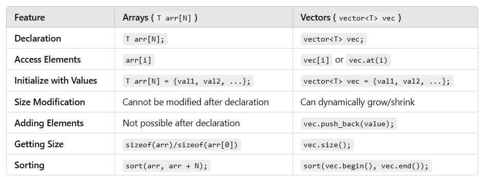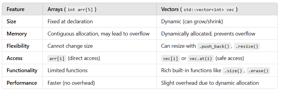 In C++, both arrays and vectors allow us to store multiple values in a structured format. However, they have fundamental differences in memory management, flexibility, and ease of use. This lesson will compare C++ arrays and vectors, highlight their key differences, and provide two example problems demonstrating when to use each.